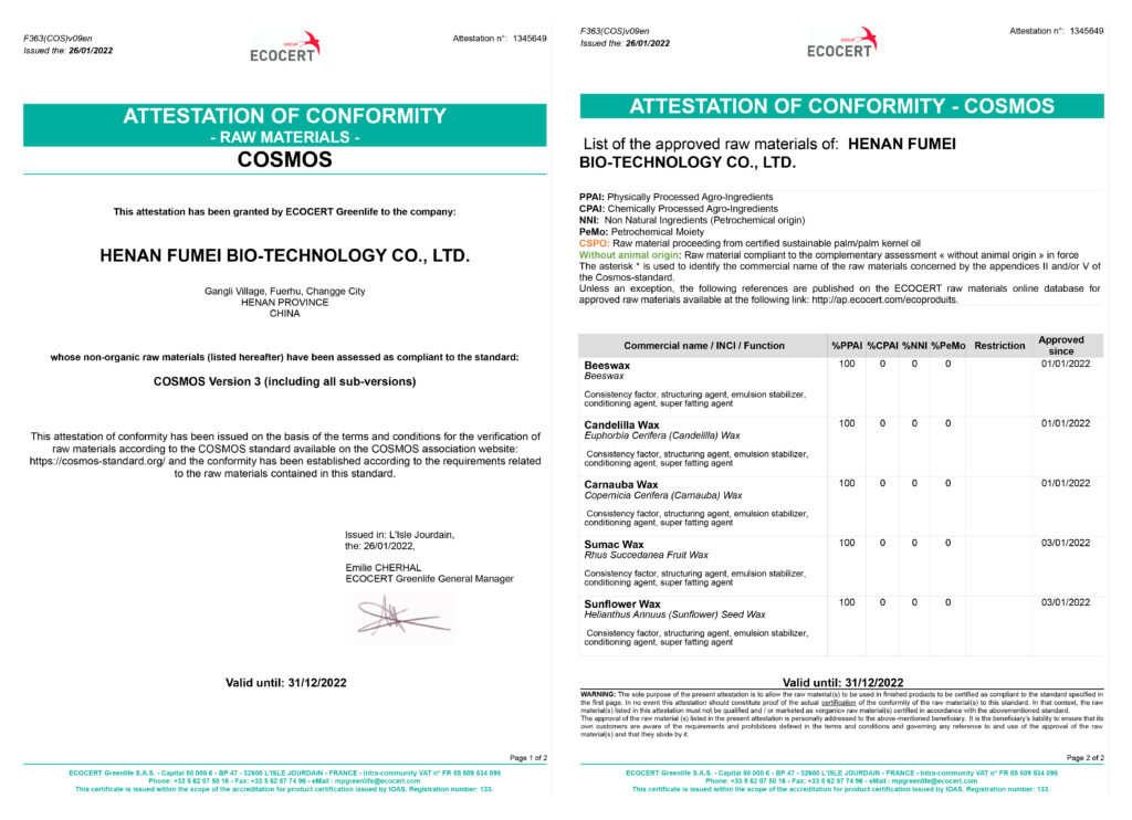 福美天然蜡产品荣获COSMOS APPROVED 证书